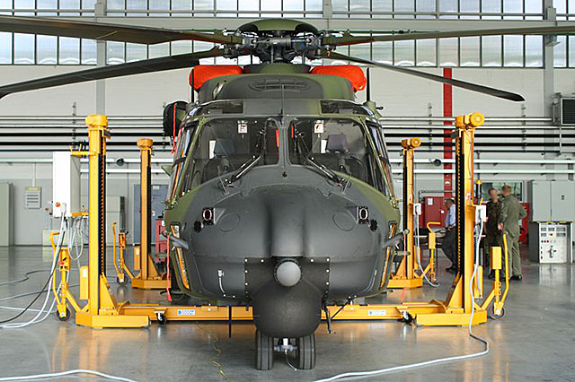 HYWEMA® supplied multiple lifting platform systems to the German Armed Forces for safely lifting the NH90 helicopter. Based on the mobile wheel clamp type RG, the specialized NH90 aircraft lifting system was developed in close cooperation with the approval authority. The helicopter is precisely lifted exclusively via custom-adapted nose and tail beams at the jacking points at working height. The beam systems allow fine positioning of the load attachments in the x and y directions for optimal alignment. The lifting system is officially certified by the German Armed Forces’ Airworthiness Authority, guaranteeing operational readiness and safety.