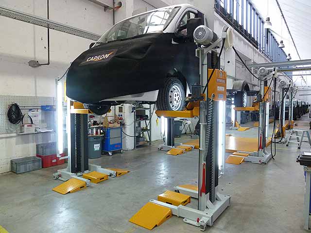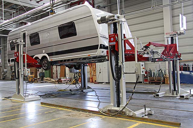 At this vehicle manufacturer, caravans, motorhomes, and vans are ergonomically lifted to working height within an assembly line. This enables assembly work both beneath and inside the lifted vehicles. Two stationary and two C-rail-mounted mobile wheel clamps provide flexible handling of vehicles of varying lengths. A key feature is the electro-hydraulically telescoping wheel forks, which extend after the vehicle is positioned. Load capture for caravans and vans is directly at the tire, with caravans additionally supported via a drawbar conveyor trolley.